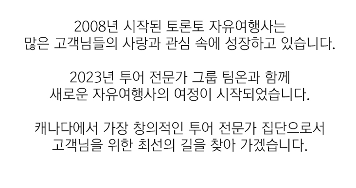 초등학생(10살)때 부모님과 함께 캐나다로 이민. 그 후 밴쿠버 2년, 미국-산타바바라 2년, 그리고 토론토에서 22년간 지내고 있습니다. University of Toronto (토론토대학교) 졸업 (Life Science 전공) / Seneca college (세네카 컬리지 졸업) Fashion Business Management 전공 활동적인 성격에 여행을 너무 좋아해서 토론토외에도 여러도시를 다녀보고 경험해왔습니다 (캐나다 횡단/ 미국 주요도시 / 멕시코 / 일본 등) 저의 경험과 지식을 바탕으로 여행자님들의 눈높이에 맞추어 모험, 열정, 그리고 즐거움을 선사하고 싶습니다!😊